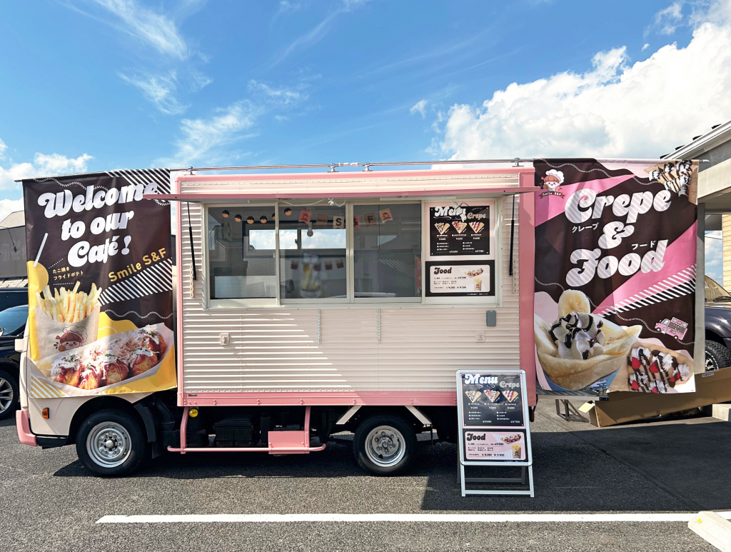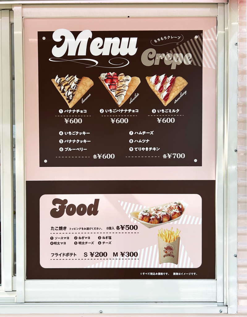 キッチンカーのピンク色に合う、ポップで可愛らしいデザインに仕上げました。画像を枠からはみ出すように配置しており、遠くからでも目を引くダイナミックなレイアウトが特徴です。